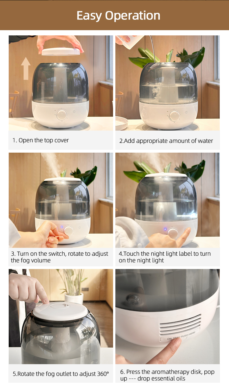 Нашиот нов ултразвучен навлажнувач за ароматерапија со голем капацитет од 5 литри Електрична употреба во домот во хотел ја прави вашата употреба побезбедна и поинтимна. Помек е од обичните навлажнувачи и не го нарушува вашето учење, работа и одмор. Пополнување на горниот дел од резервоарот за вода, практично и брзо, се гледа транспарентен резервоар за вода, нивото на водата. Нано-фина магла 300 ml/h, максимална магла може да трае 8 часа, минималната магла може да работи 50 часа, може да додаде ароматерапија за да го смири вашето расположение. Телото на овлажнител е опремено со независно ноќно светло, така што вашата ноќ е полна со сигурност.